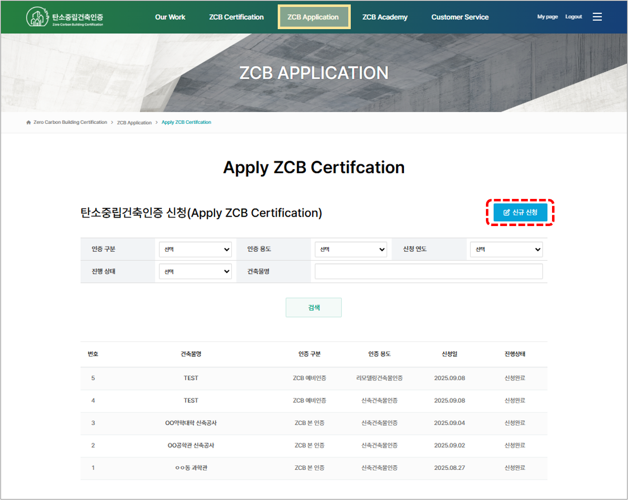 탄소중립건축인증(ZCB 인증) 신청 및 기술지원을 받기 위해서는 회원가입이 필요합니다. 이후 ZCB Application > Apply ZCB Certification 메뉴에서 로그인 후 신규 신청을 클릭하여 진행하실 수 있습니다. 탄소중립건축인증 신청정보 페이지에서 신청할 인증 정보를 입력합니다. 신청 절차는 다음과 같습니다. 1. 신청 구분에서는 ZCB 기술지원 또는 ZCB 인증 신청을 선택합니다. 2. 신청 정보에서는 해당 건축물의 인증 구분과 인증 용도를 체크합니다. 3. 신청인 정보에는 신청 건축물의 대표자와 실무 책임자 정보를 입력합니다. 4. 신청 건축물 정보에는 인증을 받고자 하는 건축물의 관련 정보를 기재합니다.