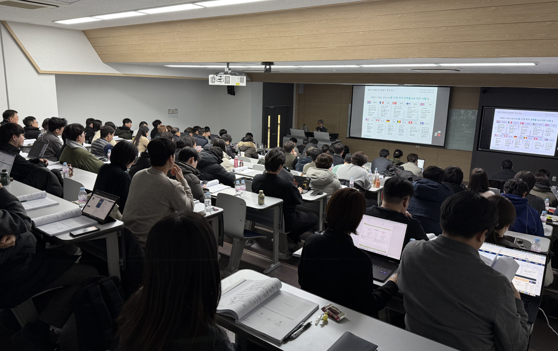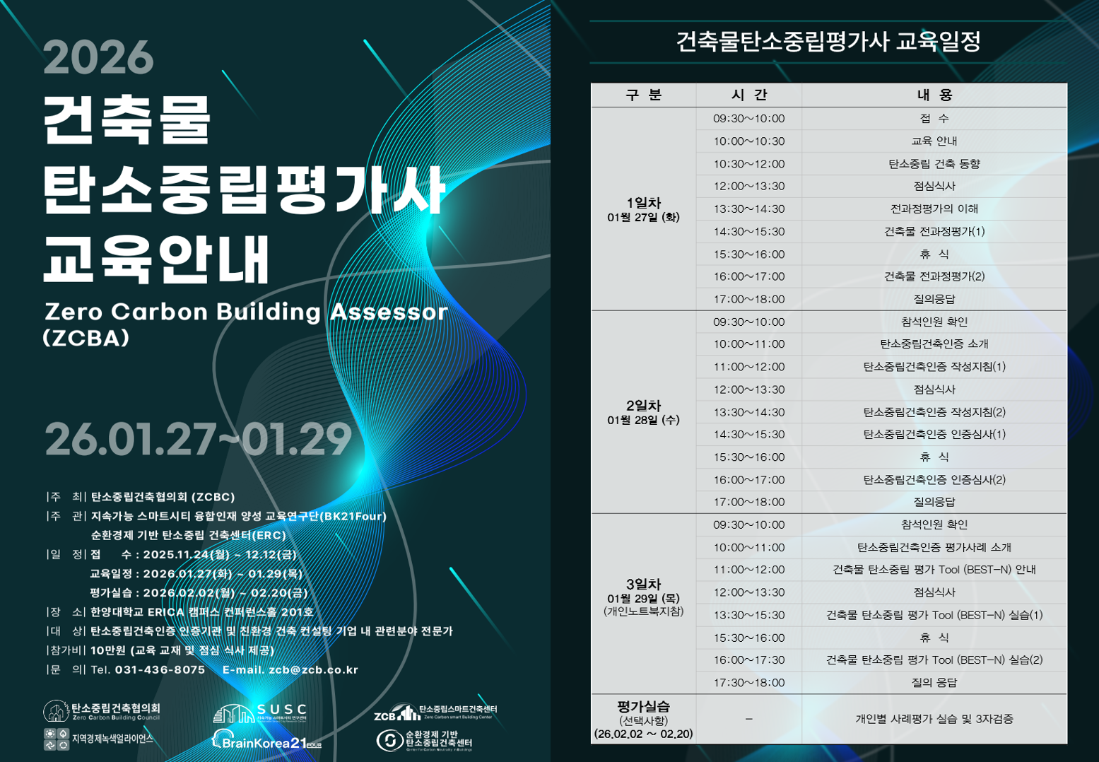 탄소중립건축인증 운영기관인 탄소중립건축협의회(ZCBC, Zero Carbon Building Council)가 주최한 ‘건축물탄소중립평가사(ZCBA, Zero Carbon Building Assessor) 교육’이 2026년 1월 27일(화)부터 29일(목)까지, 한양대학교 ERICA캠퍼스 컨퍼런스 홀에서 개최되어 성공적으로 마무리되었습니다. 이번 교육은 3일간의 이론 및 실습 교육과 3주간의 평가실습 과정으로 구성되었으며, 탄소중립건축인증의 인증기관, 검증기관, 기술지원기업(컨설팅기업) 소속 전문가들이 건축물의 탄소중립 성능을 평가하고, 검증·인증할 수 있는 실질적인 역량을 갖출 수 있도록 지원하기 위해 마련된 전문 교육 프로그램입니다. 건축물탄소중립평가사(ZCBA) 교육은 탄소중립건축인증(ZCB, Zero Carbon Building Certification)을 수행할 수 있는 전문 인력을 체계적으로 양성하기 위한 과정으로, 「탄소중립건축인증 운영규정」 제7조에 명시된 기술지원 지정 요건 중 ‘전문인력 보유’ 기준을 충족하는 교육입니다. 따라서 인증·검증·기술지원 업무에 참여하고자 하는 기관 및 전문가에게 필수적인 교육 과정으로 자리매김하고 있습니다. 이번 제1회 건축물탄소중립평가사(ZCBA) 교육은 단순한 이론 중심 교육을 넘어, 인증 전용 평가 Tool인 ‘BEST-CENSOR 프로그램을 이용한 건축물 탄소중립 성능 평가방법에 대한 교육이 이루어졌습니다. 무엇보다 이번 교육에서는 3주간의 평가실습 과정을 통해 제공된 가상의 프로젝트에 대해 BEST-CENCER를 이용해 수강생들이 개별적으로 평가 업무를 경험할 수 있는 과정을 포함하고 있습니다. 각 일자 별 주요 내용은 다음과 같습니다. ■ 1일차: 탄소중립건축동향, 전과정평가의 이해, 건축물 전과정평가 ■ 2일차: 탄소중립건축인증 소개, 작성지침, 기술지원 및 인증심사 ■ 3일차: 탄소중립건축인증 평가사례, 건축물 탄소중립 평가 Tool(BEST-CENSOR) 실습 [1일차 교육 탄소중립 건축 동향 및 전과정평가의 이해] 교육 첫날에는 탄소중립건축의 국내외 동향과 제도적 흐름, 그리고 탄소중립건축인증(ZCB)의 개요에 대해 심도 있게 다루었습니다. 기후위기 대응을 위한 국제사회의 탄소중립 정책과 건축분야의 실천 방향, 이를 제도화하기 위한 국내 인증 시스템의 배경과 목적 등을 살펴보며, 건축물탄소중립평가사의 역할과 중요성에 대한 전반적인 이해를 높이는 시간이었습니다. 특히, 건축물 전과정평가(LCA, Life Cycle Assessment)에 대한 기본 개념과 절차를 중심으로, ZCB 인증에서 왜 LCA가 핵심 평가 요소로 작용하는지, 건축물 전 생애 주기에서 발생하는 탄소배출량을 어떻게 분석하는지를 사례 중심으로 학습했습니다.